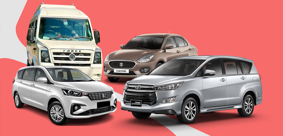 One can choose from our range of Tata Zest, Innova Crysta, Innova Ertiga, Swift Dzire, Hona City, Tempo Traveler and 52 Sheeter Bus. Large groups can also choose from our fleet of large and Mini & Mid-Size luxury Coaches.